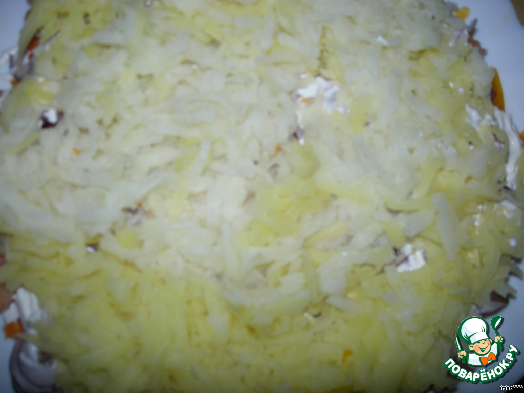 4 шаг. Сыр натереть на крупной терке, выложить третьим слоем на салат и смазать заправкой.