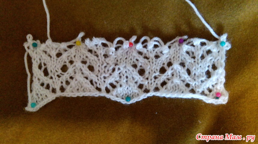 24 п. х 28 р. = 10 х 10 см, связано ажурным узором спицами №3.