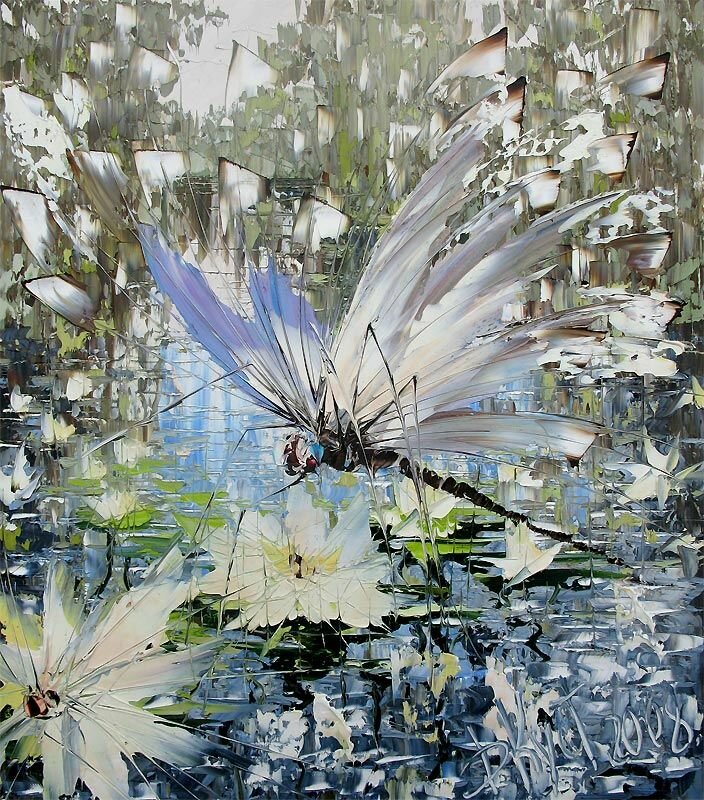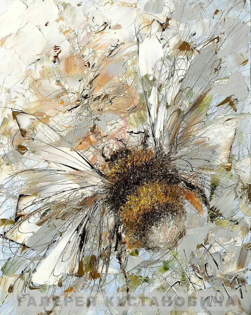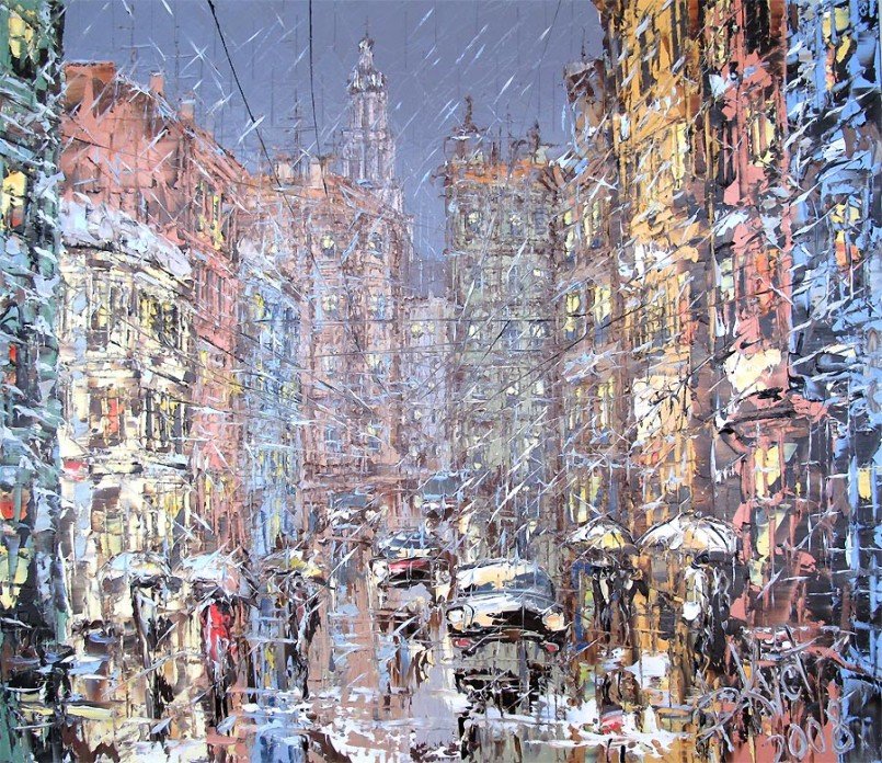 Глубоким фактурным слоем прямо на холсте мастер создает густую палитру, на которой технично и точно формирует свой творческий замысел.