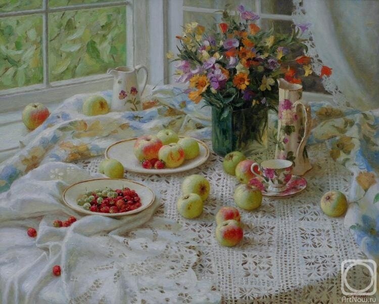 Густой запах яблок смешался с ароматом свежезаваренного чая, бабушкиных пирожков, цветов из вазы и счастливого солнечного лета – это маленький кусочек давно ушедшего детства на холсте художника.