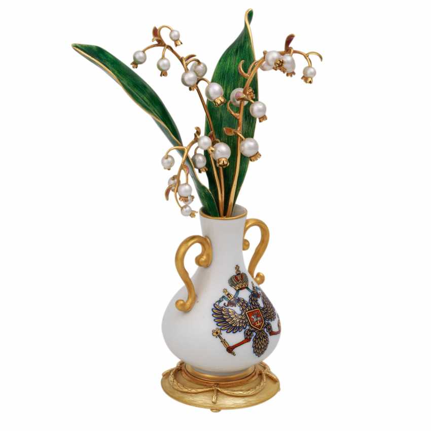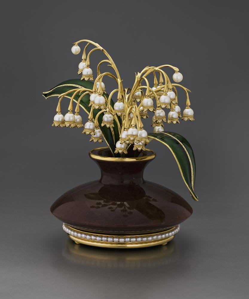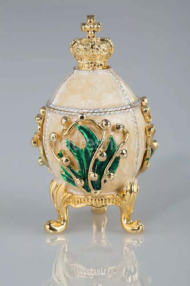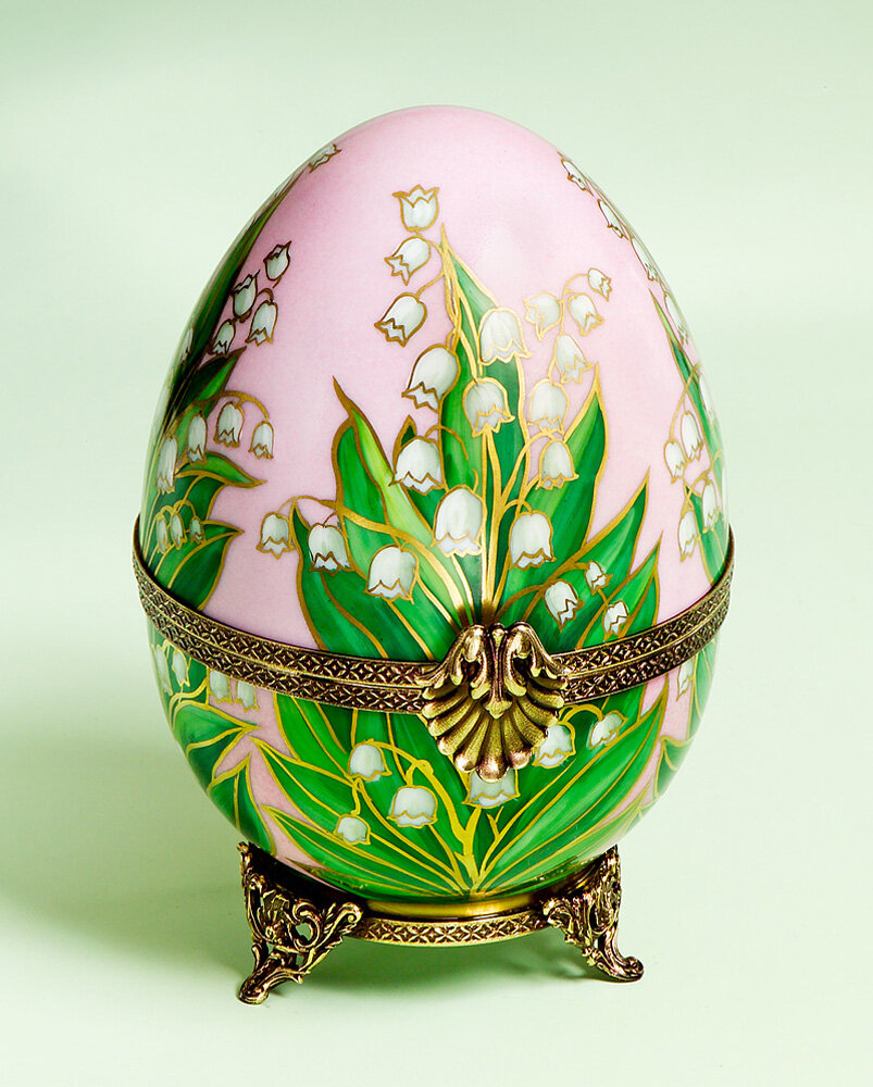 Яйцо выполнено в стиле модерн. Само яйцо, выполненное из полупрозрачной розовой эмали с гильошированой поверхностью, находится на золотой подставке с четырьмя ножками. На яйцо крепятся ландыши, выполненные из зелёной эмали, золота и жемчуга.
