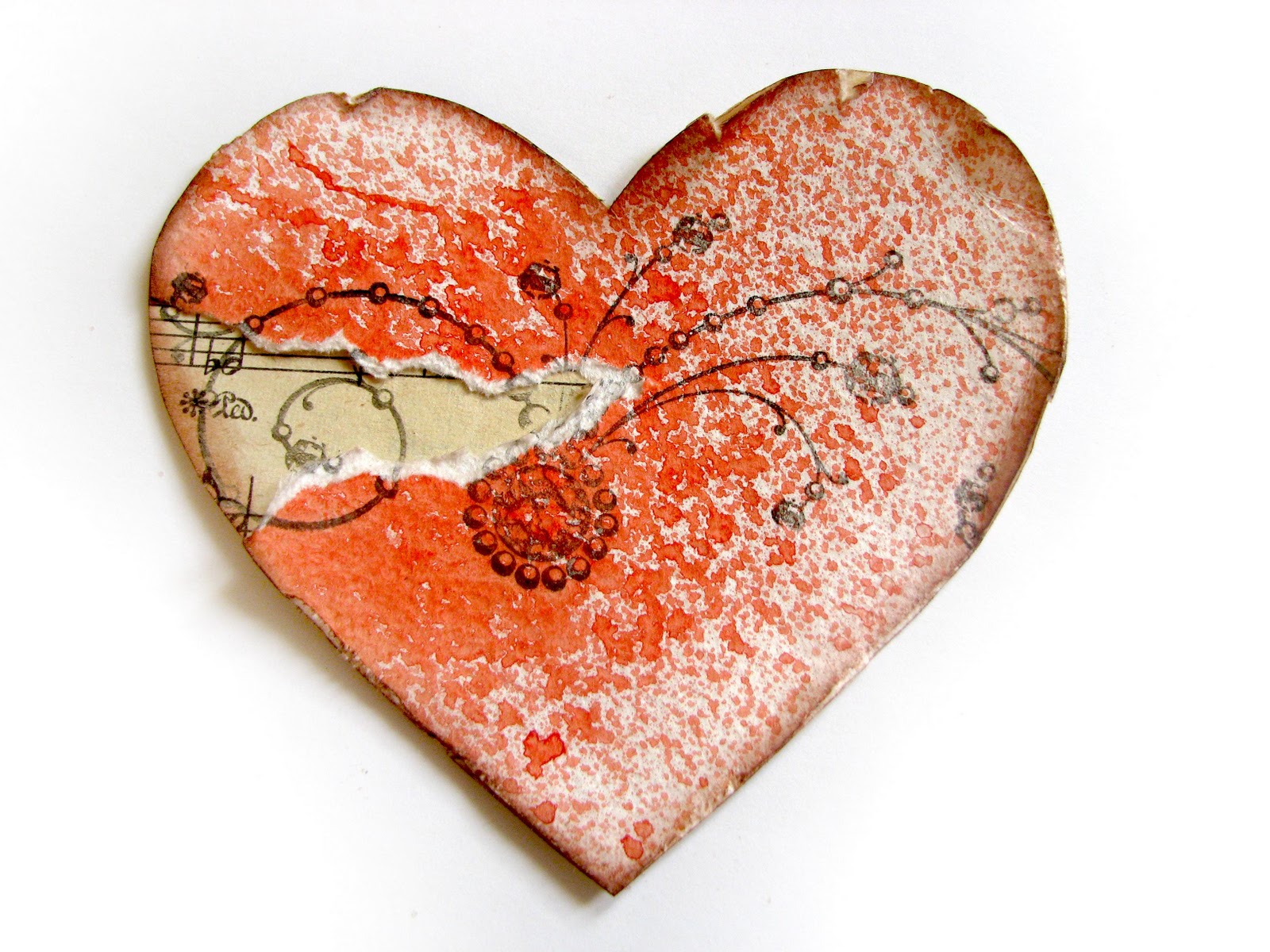 Приклеиваем к обратной стороне сердце-заплатку, поверх штампуем орнамент черным цветом, края сердца немного состариваем.