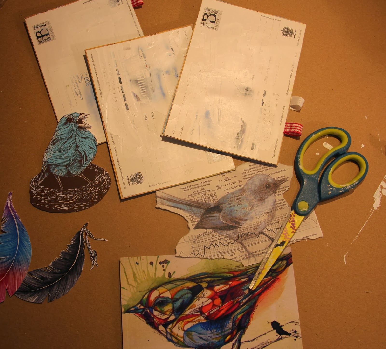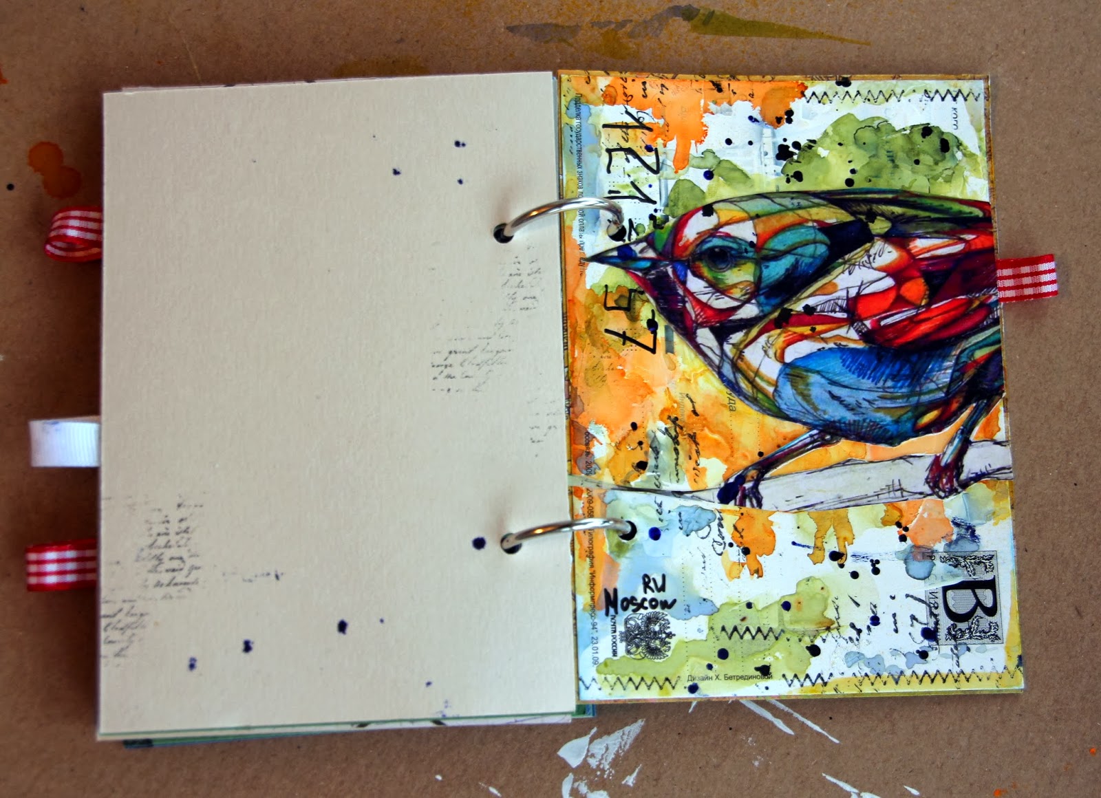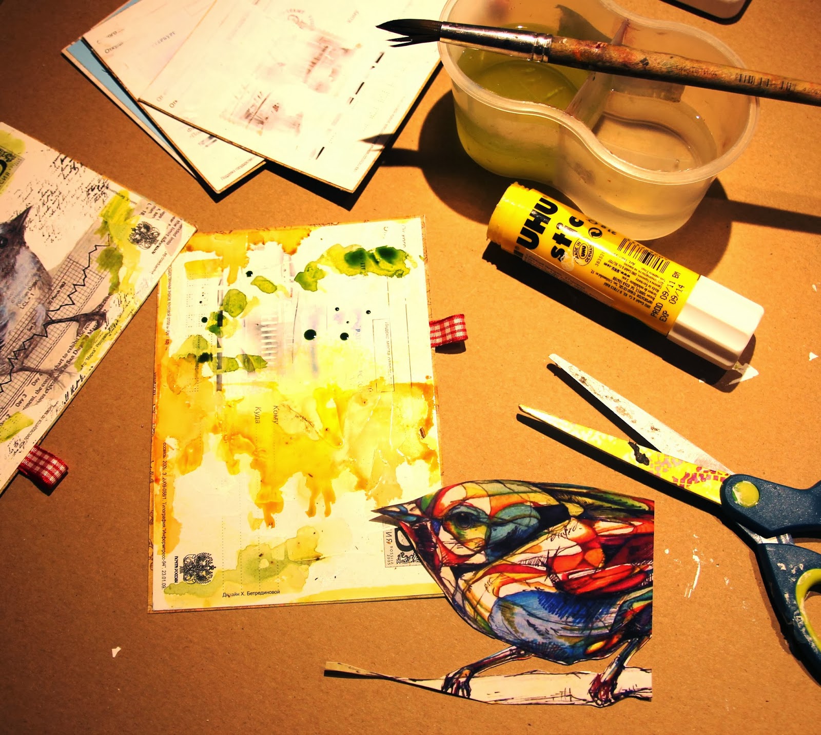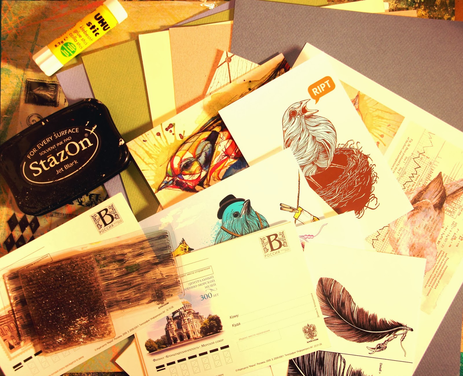 В работе использовала: картинки птиц, распечатанные на матовой фотобумаге, почтовые карточки (купленные на почте), штампы, бумага для пастели, клей, тесьма, акриловый грунт, спреи разных цветов, вода, кисть, акриловая белая ручка и архивный фломастер.