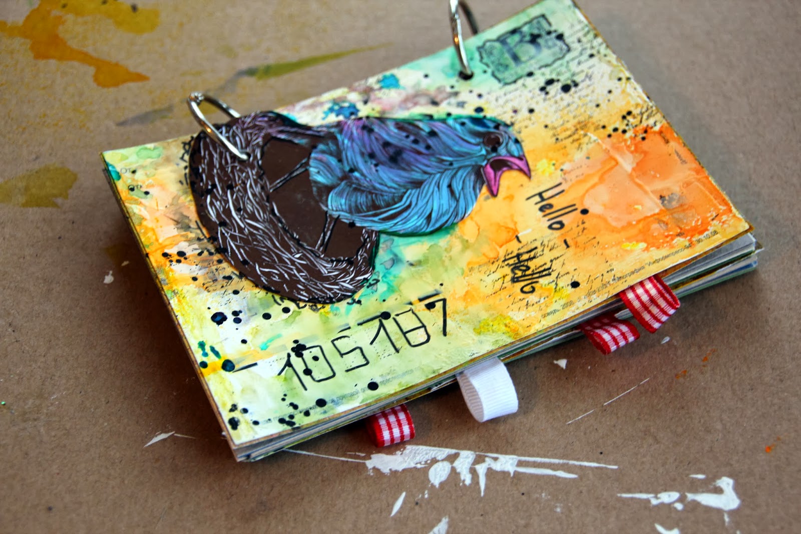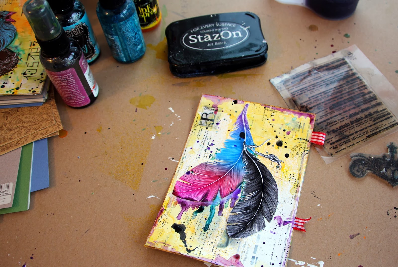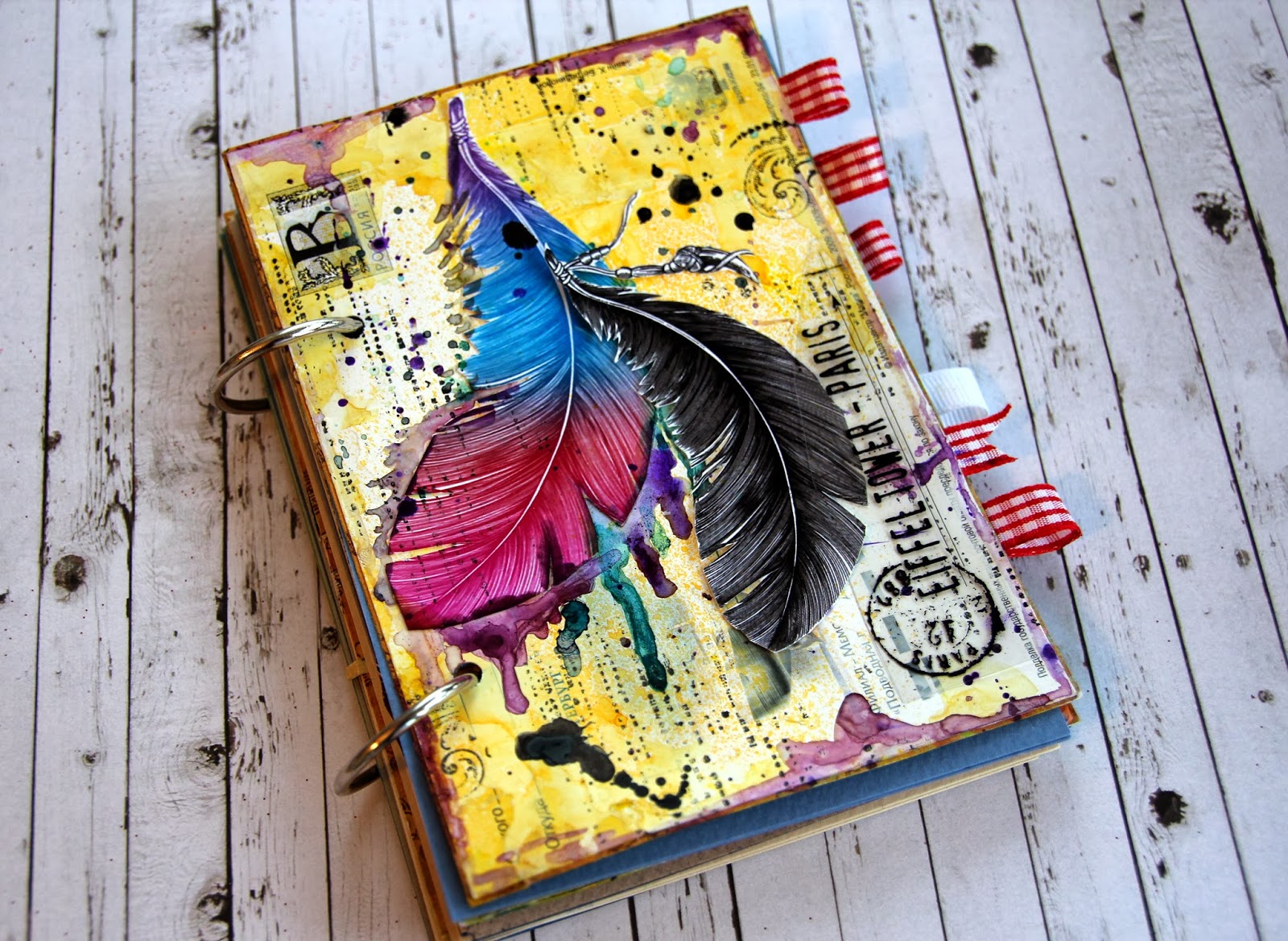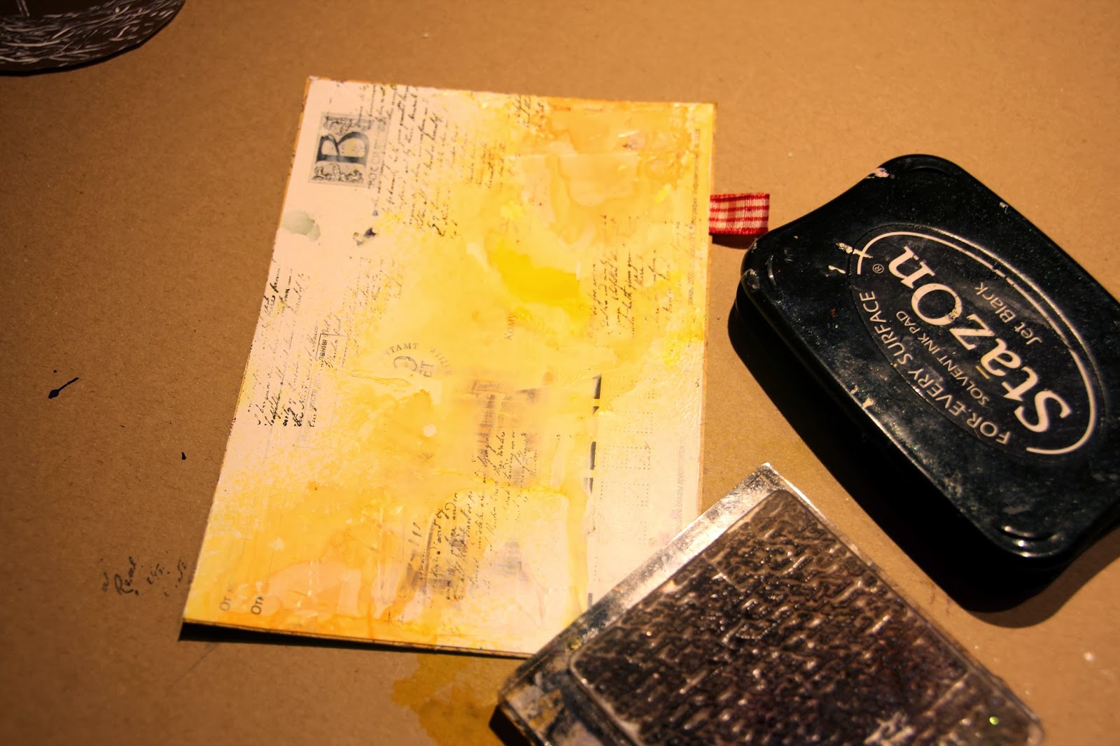 Добавляю немного штампов, дудлинга (архивным фломастером), капель туши.. И готово!