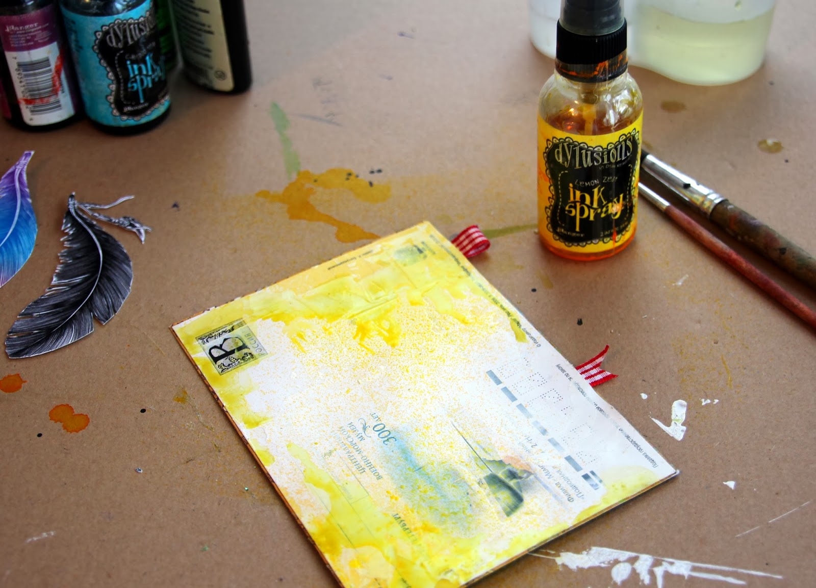 С помощью разноцветных спреев, воды и кисти делаю фон... Получается эффект акварельных пятен.