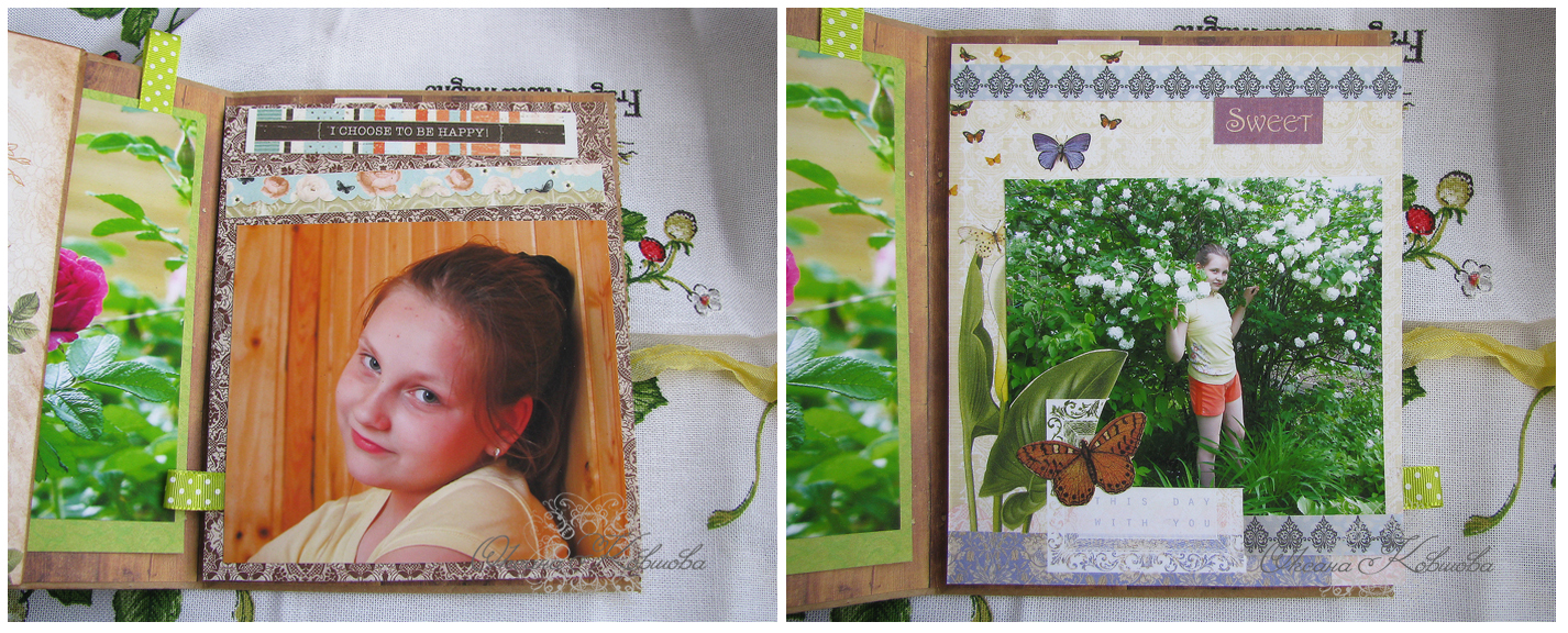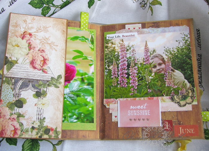 А дальше начинаем оформлять альбомчик согласно задумке. Я решила оставить память о самом первом июньском дне, когда мы наконец смогли расслабиться, уехать на дачу и начать наслаждаться каникулами. Моя 11-летняя дочь с недавних пор очень полюбила фотографироваться, её личико постоянно появляется перед камерой:). Особенно удачные фотографии того дня я и поместила в свой миник.