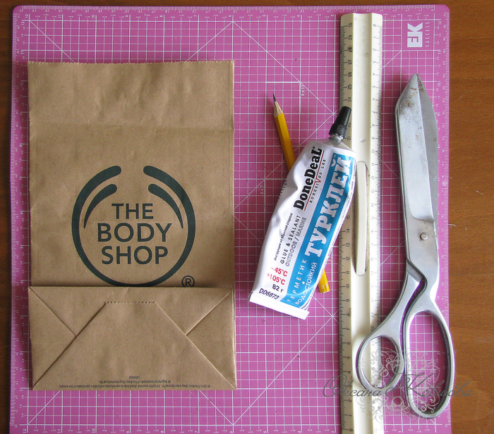 Итак, для работы нам понадобится крафт-пакетик подходящего размера (у меня 24*15 см), а также самые обычные инструменты: клей, ножницы, линейка, карандаш.