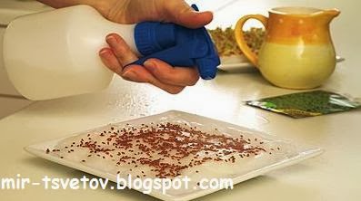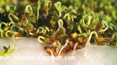 При посеве вместо субстрата используем целлюлозу, бумажные салфетки, вату или нетканый текстиль. Положим ткань (или вату и т.д.) на мелкую тарелку и польем водой. На ткань, пропитанную водой, насыпаем семена и побрызгаем их водой из разбрызгивателя - семена не должны плавать в воде. Тарелку поставим на светлое, теплое место, ткань поддерживаем влажной.