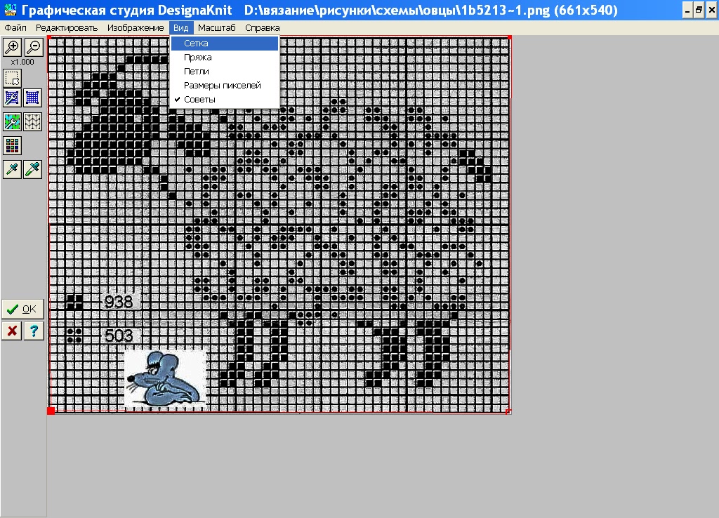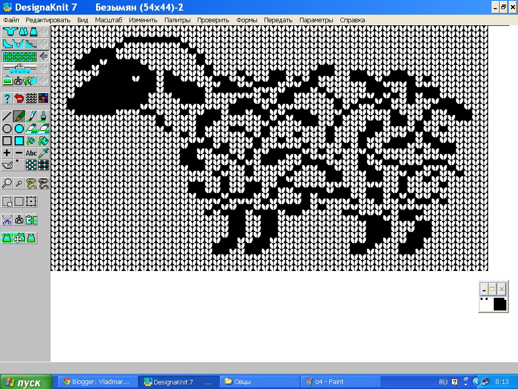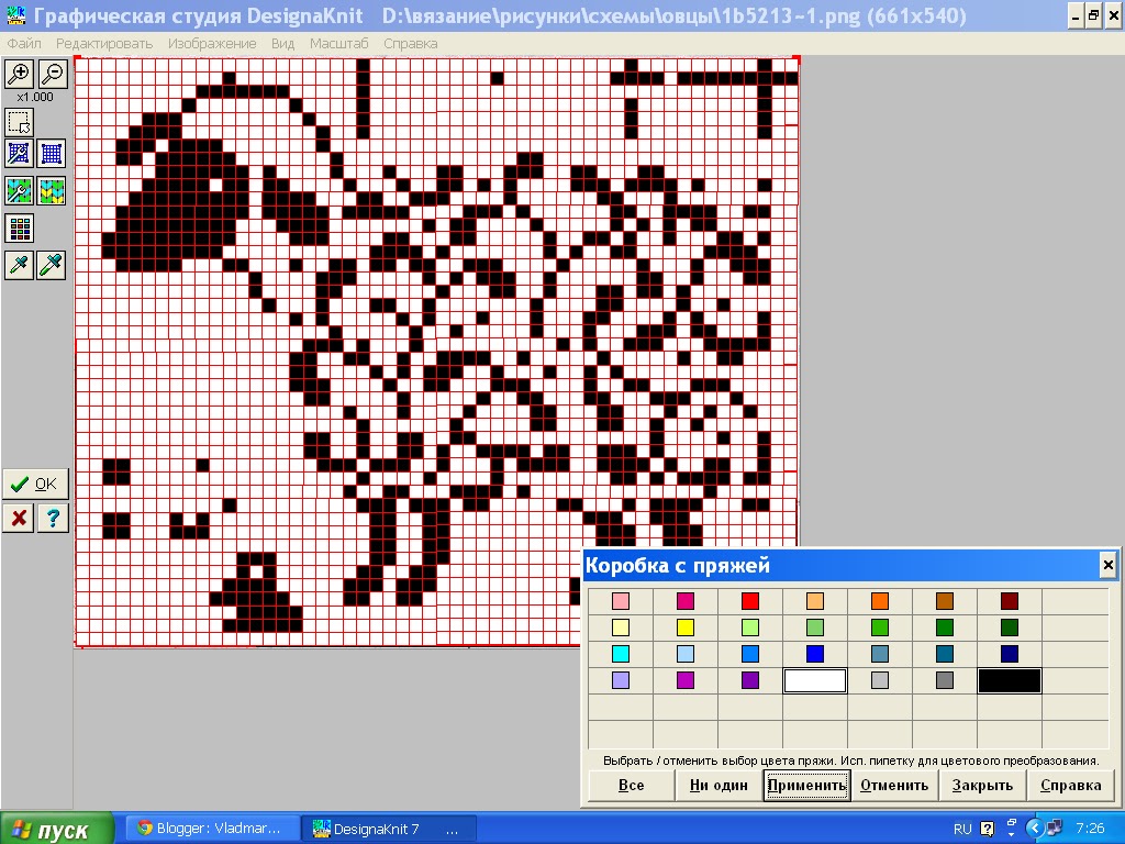 Конвертация изображений на сетке (сканы или фотографии схем) в Графической студии - одна из самых полезных функций программы ДК7, т.к. значительно экономит время, потраченное на создание дизайна для трикотажного изделия. Результат работы зависит от качества фотографии или скана. Если сетка очень перекошена и качество плохое, то нет другого выхода как наклацать рисунок мышкой по клеточкам. Я выбрала изображение среднего качества, чуть увеличив контрастность. Очень важный момент: нужно обязательно посчитать количество клеток по горизонтали и вертикали.На схемах обычно есть значения координат, к тому же квадратики 10х10 выделены более жирными линиями. Но сделайть это нужно точно и записать или запомнить. Спрос на такие изображения появится вот-вот, т.к. приближающийся 2015-й год будет годом Овцы. Надо уже начинать готовится)))
