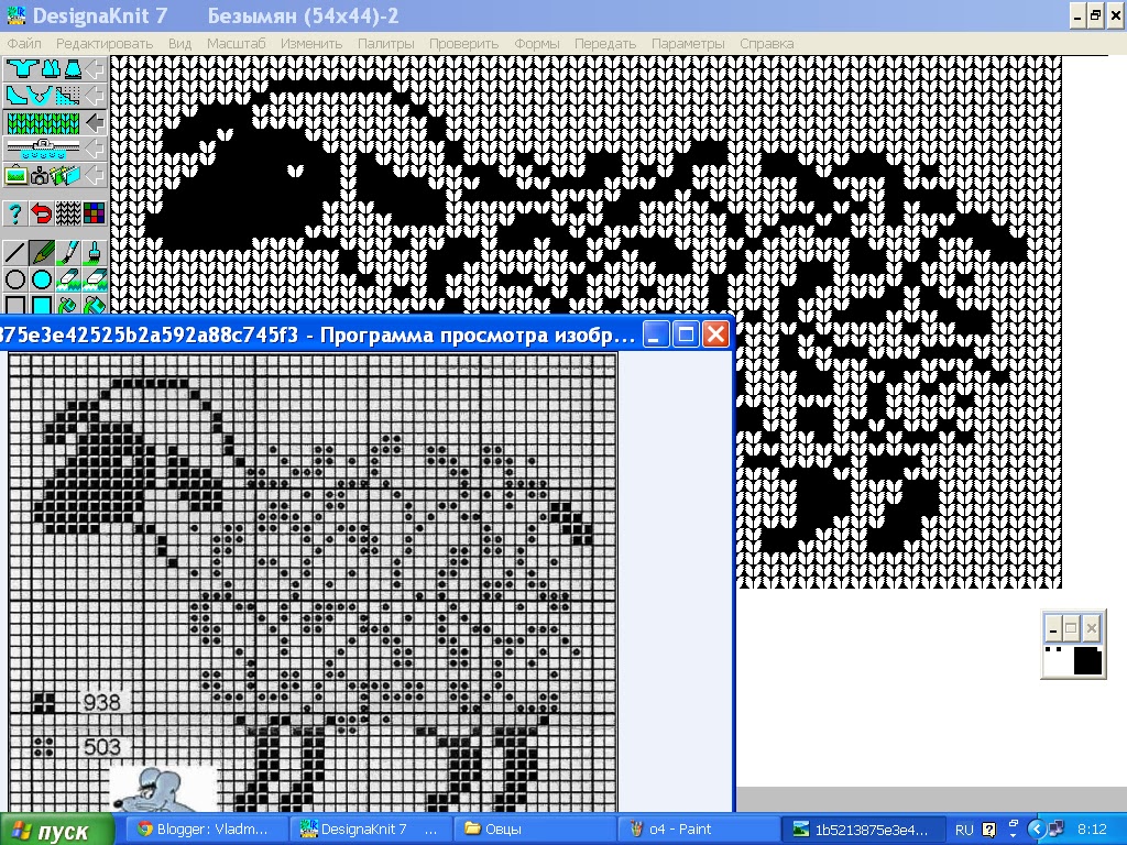 Изображение появляется в Дизайнере узора. где мы можем его подредактировать. Для этого открываем для просмотра исходную картинку и сравниваем. Где нужно инструментами Кисть, Карандаш, Заливка исправляем неточности. Но перед этим обязательно удаляем лишние цвета на палитре, оставив только черный и белый. Мы это тоже делали в уроке