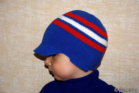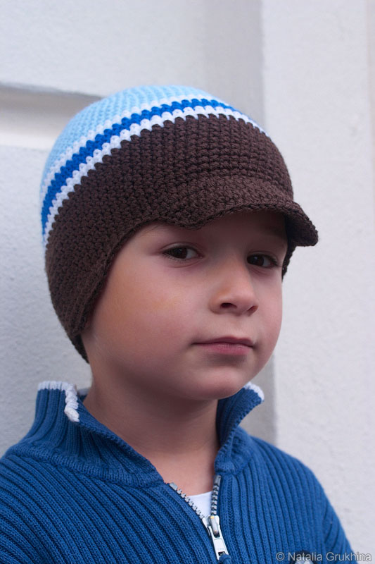 За счет такого способа вязания козырек получается более жестким, чем сама шапочка, и держит полукруглую форму без накрахмаливания.