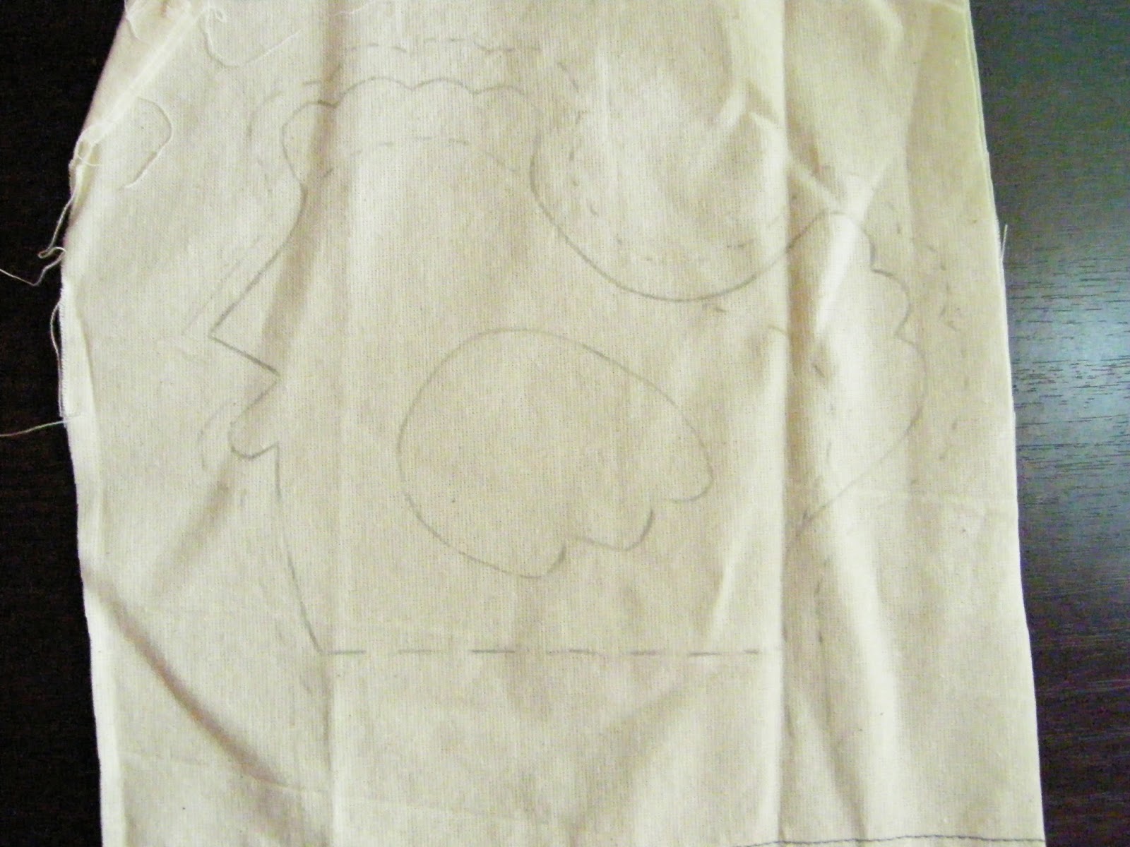 2. Переносим нашу выкройку на ткань, вырезаем с небольшим запасом. Крыла должно быть два. Затем приметываем с лицевой стороны хохолок из ниток, хвостик, крылья и клюв. Клюв из фетра (на фото не видно, он кончиком повернут во внутреннюю сторону, как и все перечисленные детали).