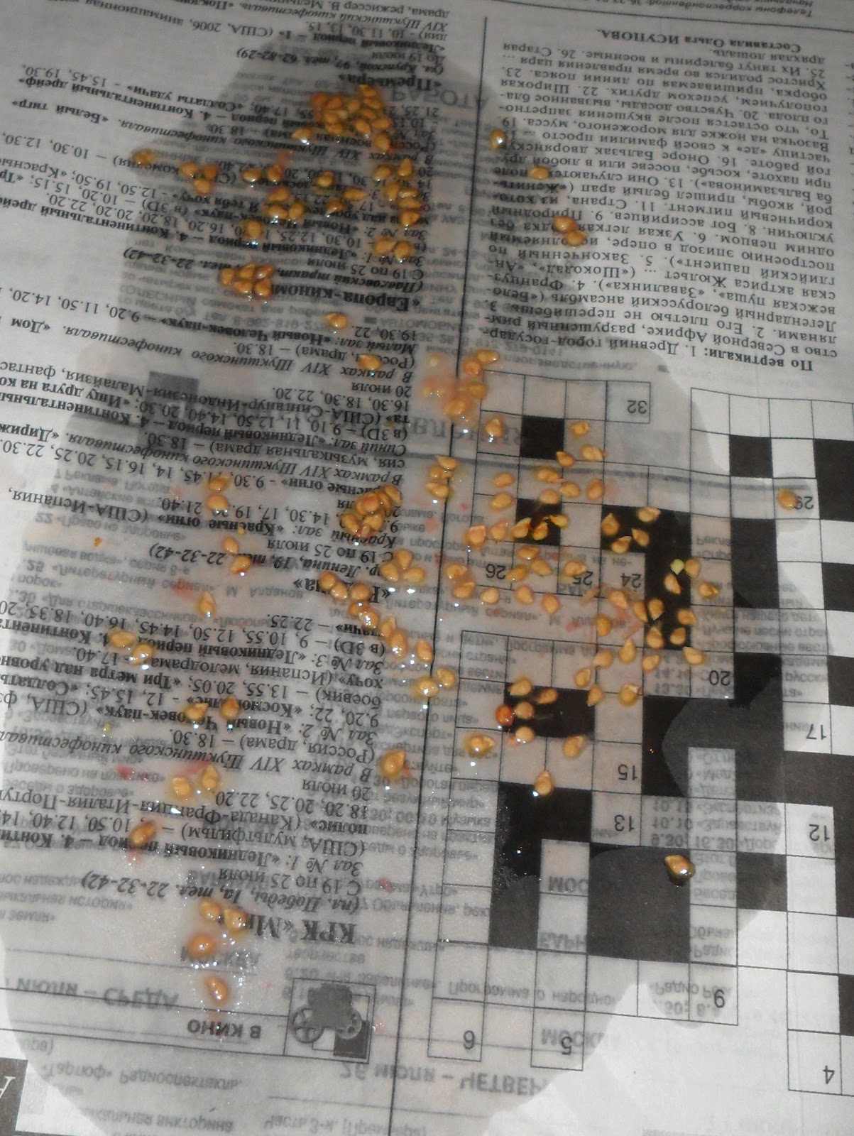 Газета хорошо впитывает остатки воды, и через час-два еще влажные семена перекладываю с намокшей газеты на другую – сухую. Прямо на газете пишу сорт помидора и убираю уже для более тщательной просушки куда-нибудь на два-три дня.