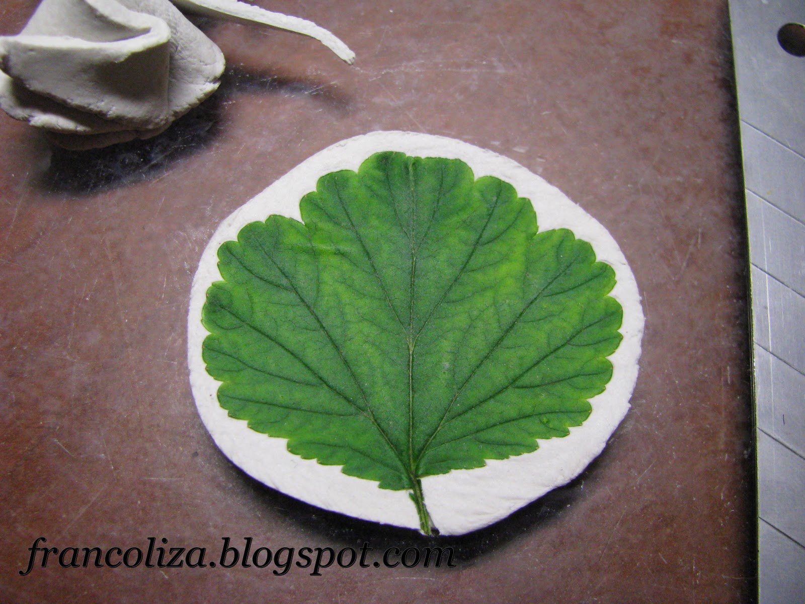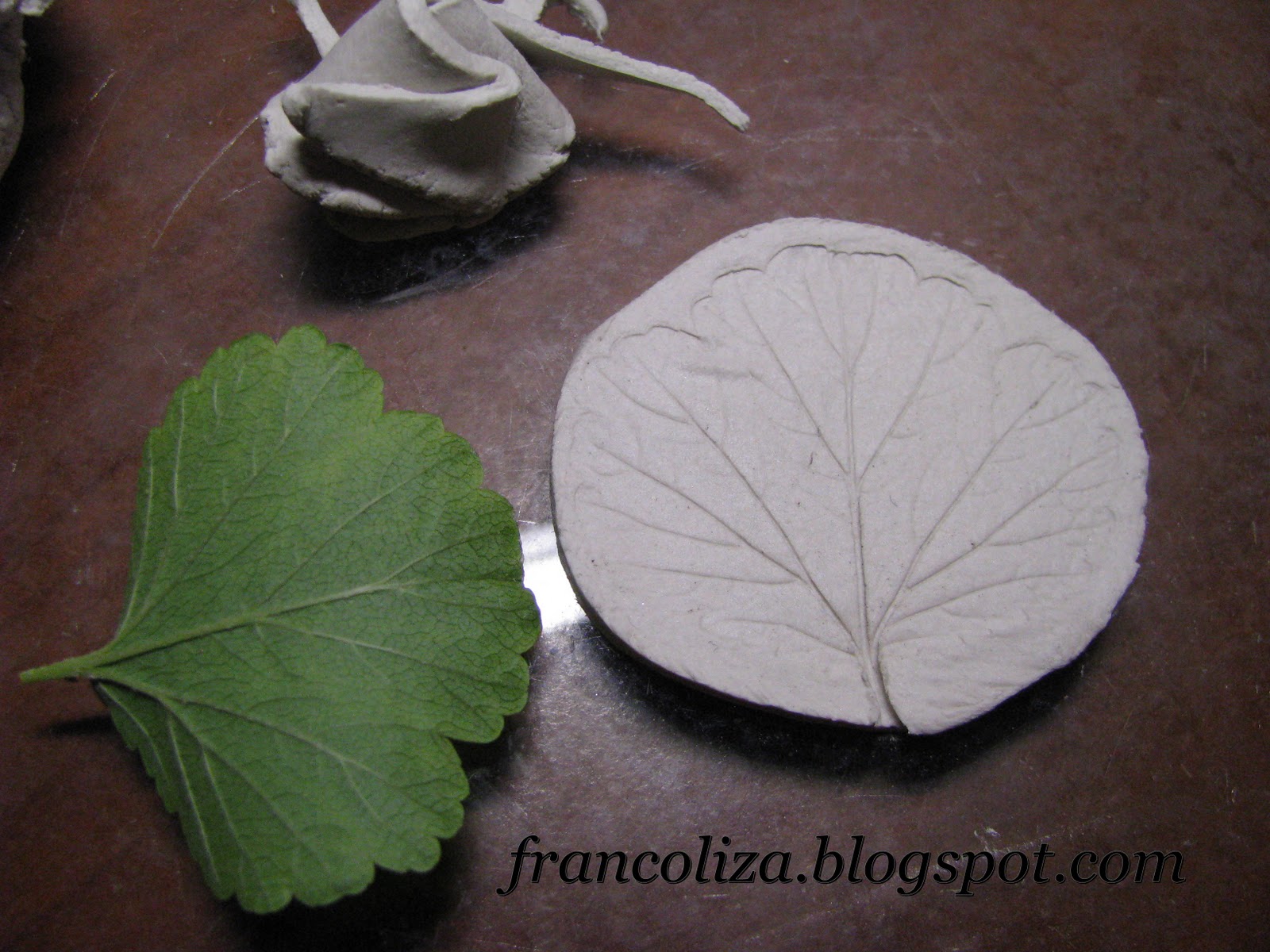 На верх лепешки положить листик лицевой стороной вверх. Так потому, что на изнаночной стороне лица прожилок больше и получится молд намного красивее. Прокатать скалкой по листу, немного примяв его в глину.