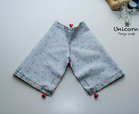 Соединяем и прострачиваем шаговый шов. Лучше в 2 приема, из середины вначале одну штанину, затем из середины вторую штанину. Так не будет перекосов и съехавших краев.