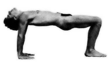 Исходное положение — опора на ладони рук и пальцы ног, прогнувшись. Руки и ноги чуть шире плеч. Голова поднята и запрокинута назад. Выдох. Со вдохом, не сгибая рук и ног,