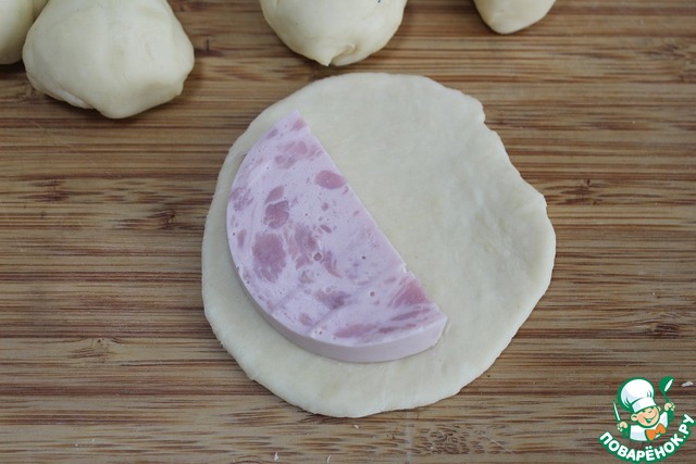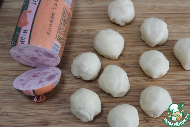 Нарезать не тонко колбасу и каждый кружок колбасы еще пополам.