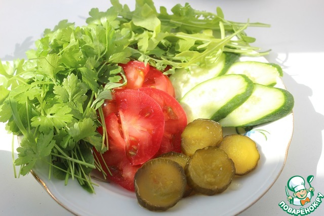 Готовая начинка (у меня помидоры, свежие огурцы, маринованные огурцы и зелень.) — по вкусу