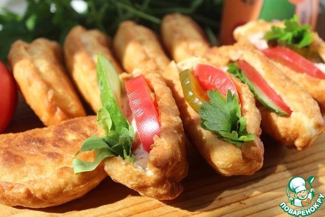 Нежное и хрустящее тесто, вкуснейшая колбаса из индейки и сочные овощи с зеленью! Жарим, как пирожок с колбасой, потом разрезаем и начиняем по своему вкусу. Очень вкусно и очень просто! Нравится и взрослым и детям. Пробуем?