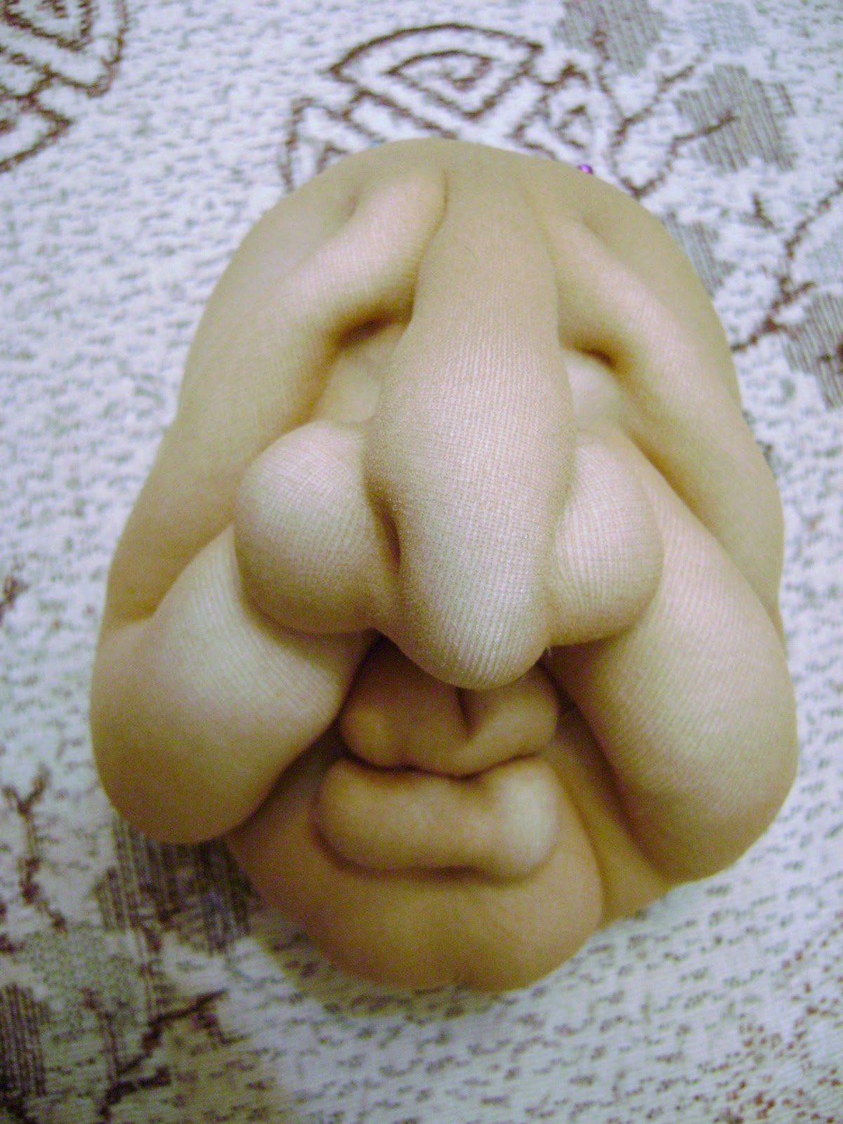 [показать] Далее берём отрез колготки,разрезаем вдоль пополам и прикалываем булавочками к лицу куклы.