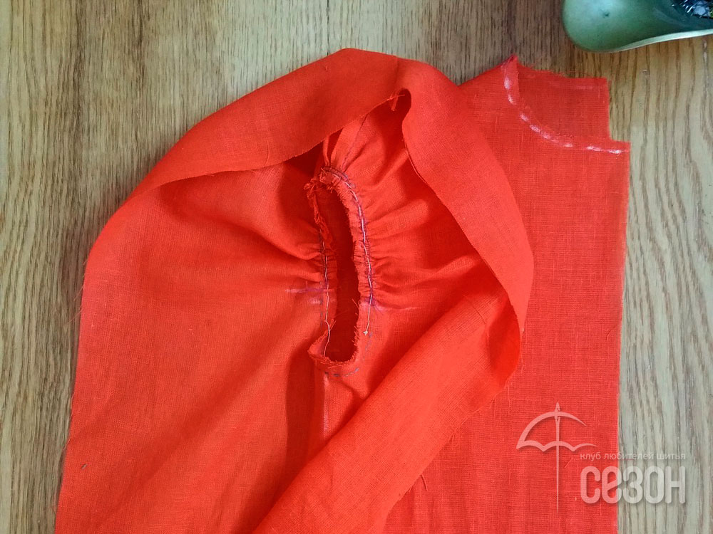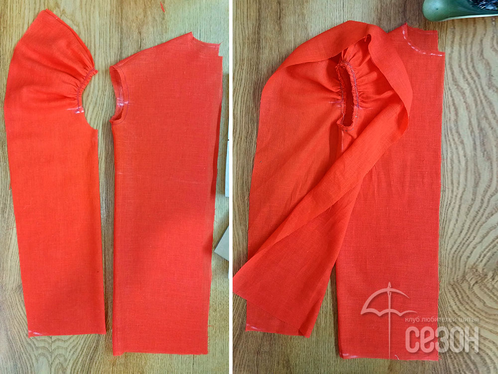 Сшиваем шов рукава, собираем верхнюю часть проймы рукава на сборку и вмётываем рукав в пройму.
