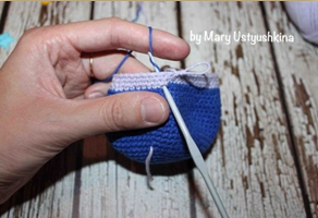 Меняем на пряжу сиреневого цвета, но синюю нить пока не обрезаем