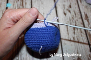 Рожки набить и пришить к голове на уровне 21 и 32 ряда с промежутком между ними в 3 столбика.