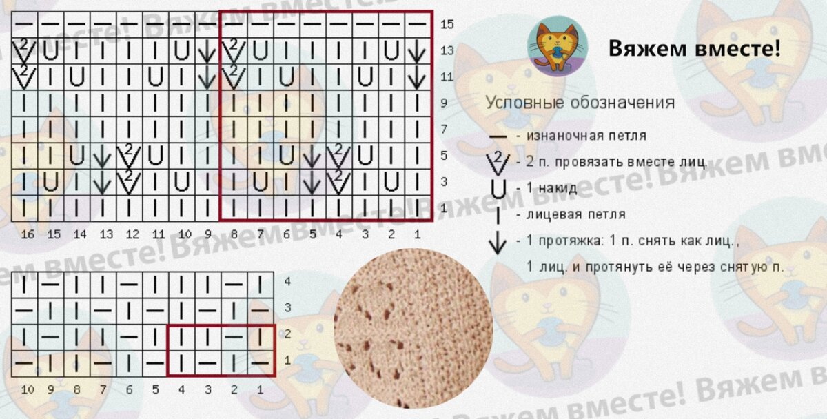 Раппорт ажурного узора равен 8 петлям по ширине и 16 рядам по высоте. На схеме даны только лицевые ряды вязания, изнаночные вяжутся так, как лежат петли на спице.