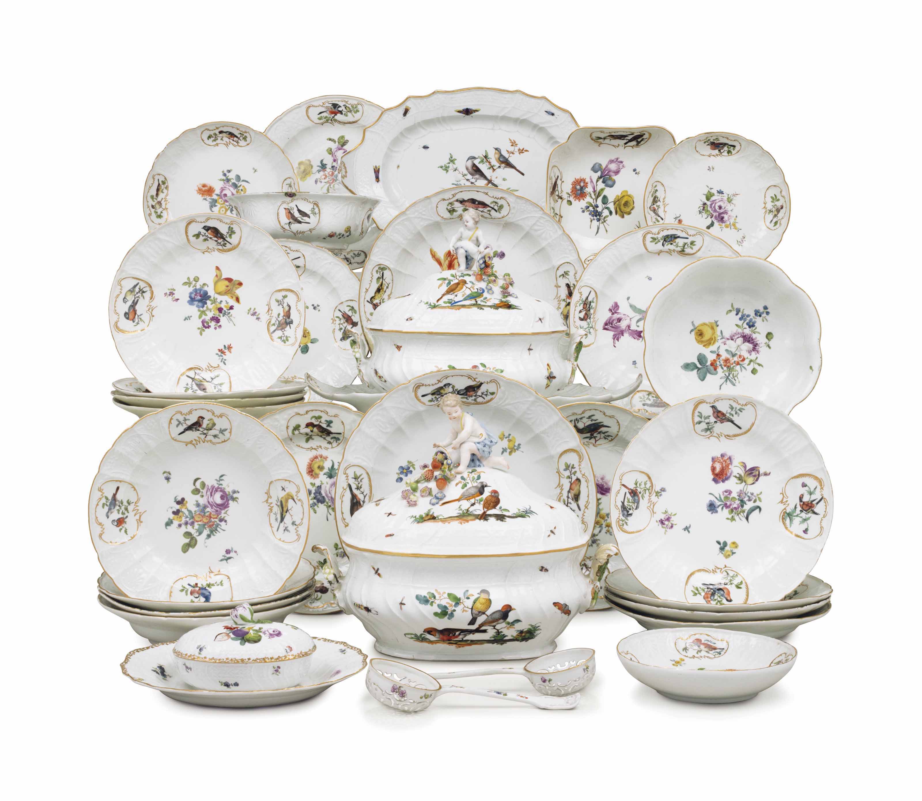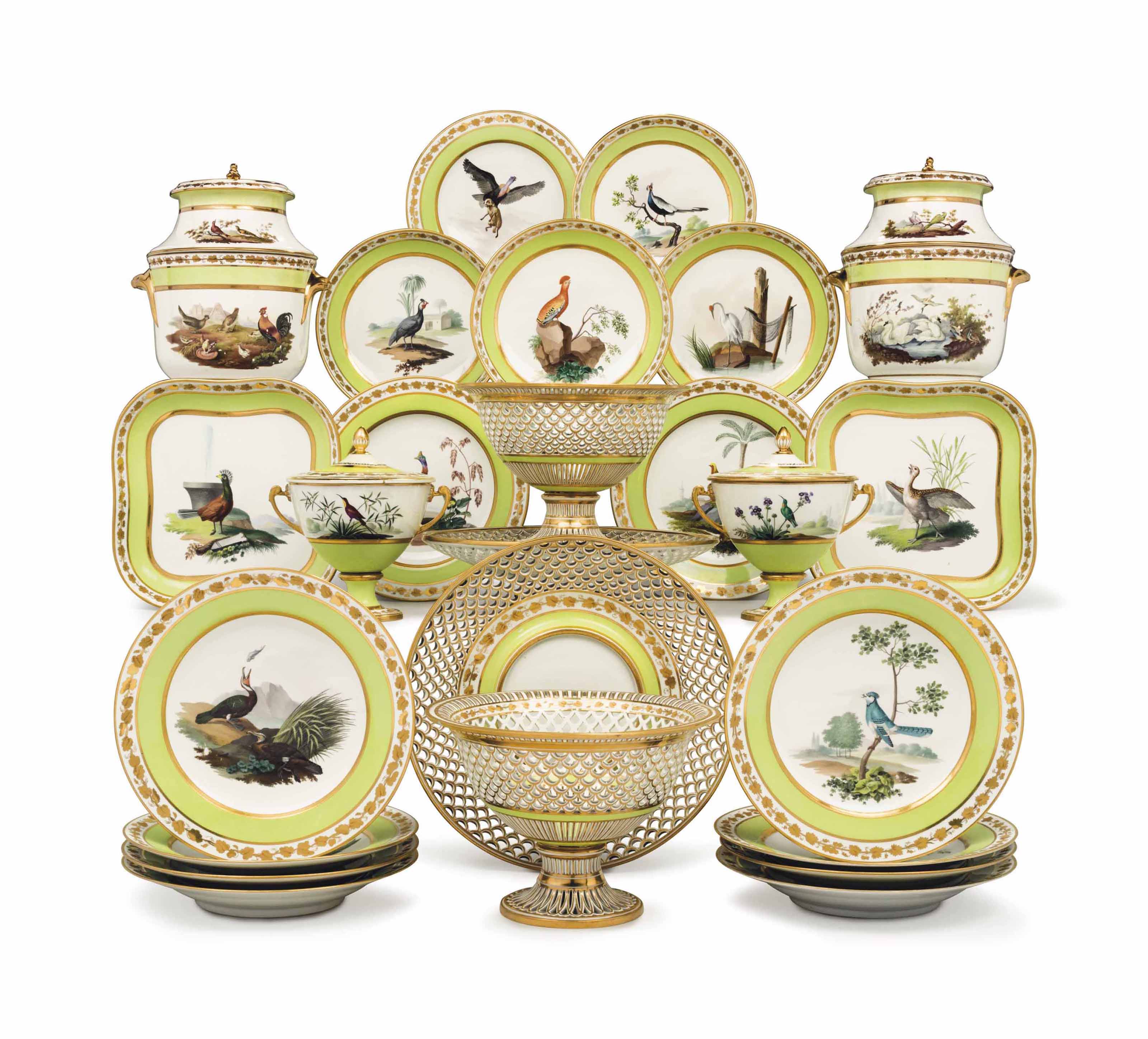 A SEVRES PORCELAIN BLEU CELESTE 'OEIL DE PERDRIX' ORNITHOLOGICAL PART DESSERT SERVICE