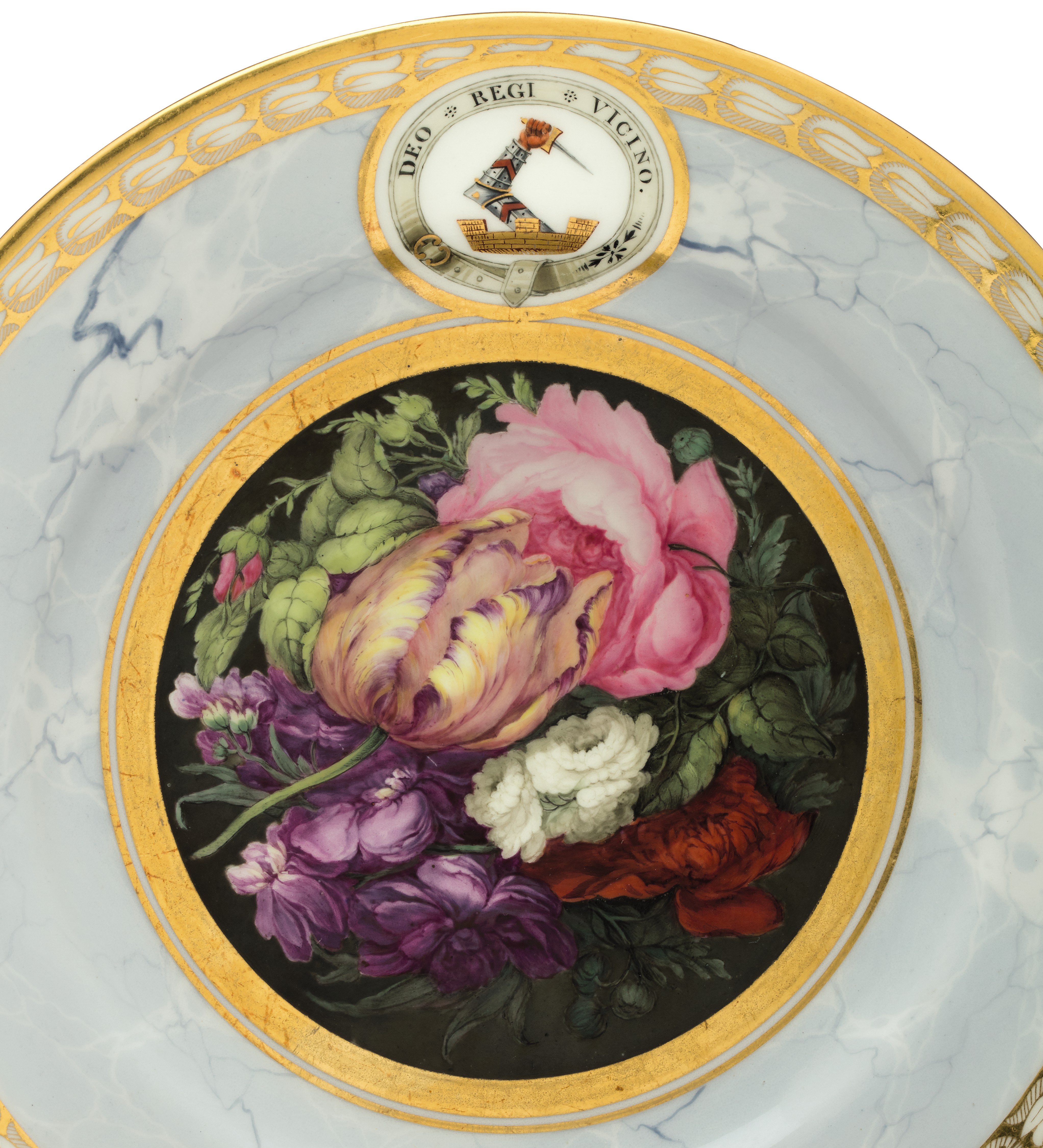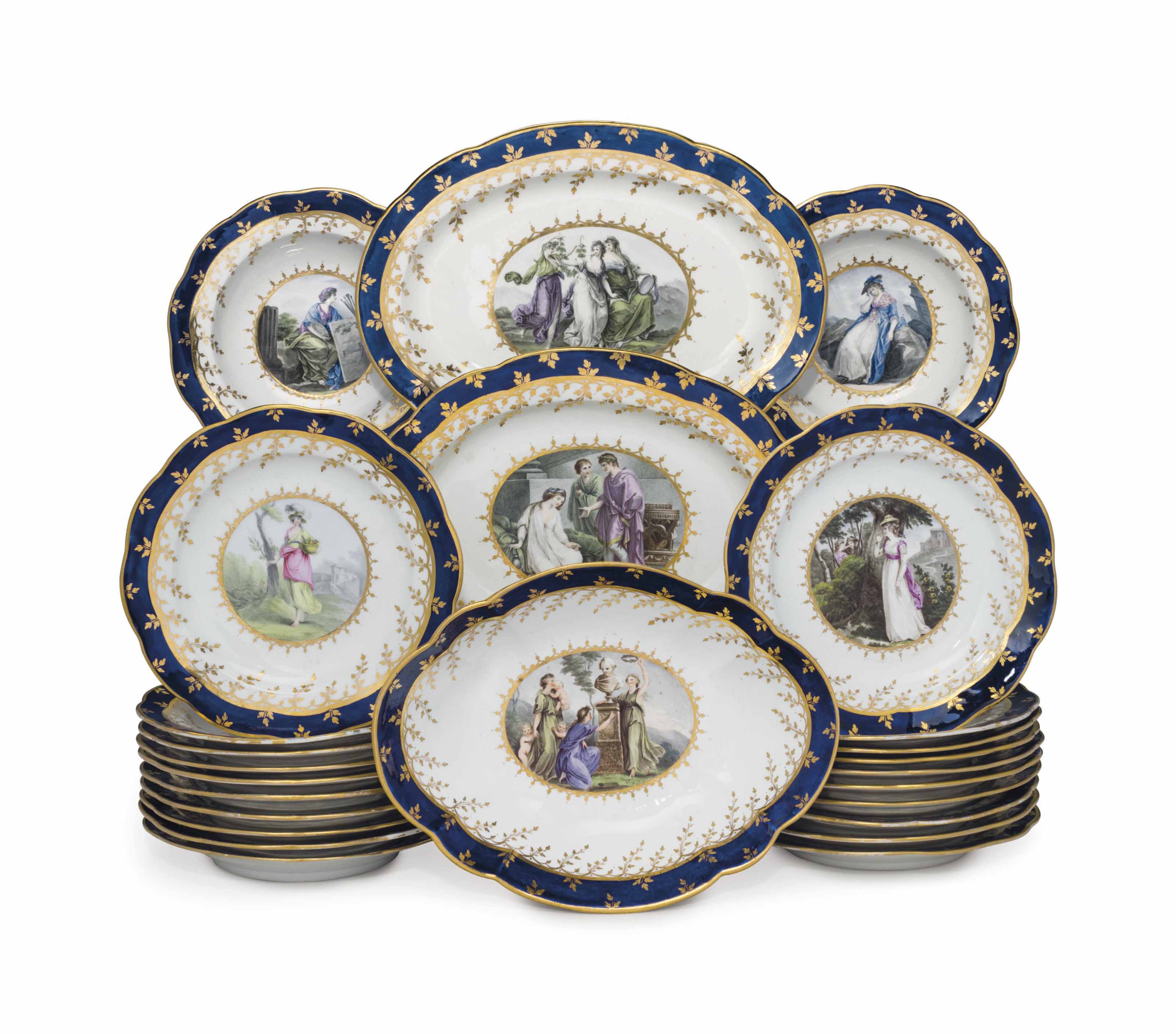 CIRCA 1782-86, BLUE INTERLACED L'S MARKS, MOST ENCLOSING DATE LETTER EE, HH OR II, VARIOUS PAINTER'S MARKS, MOST WITH GILDER'S MARKS FOR VINCENT PERE, GIRARD, OR LA FRANCE
