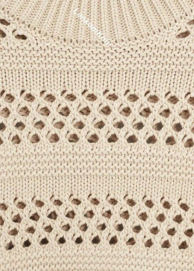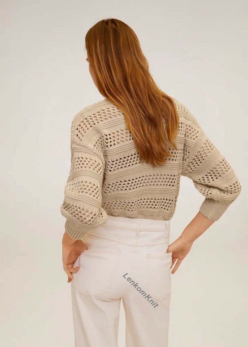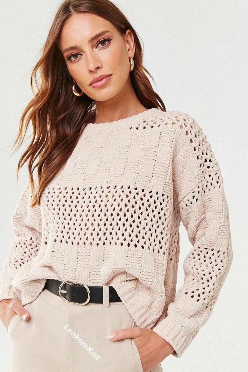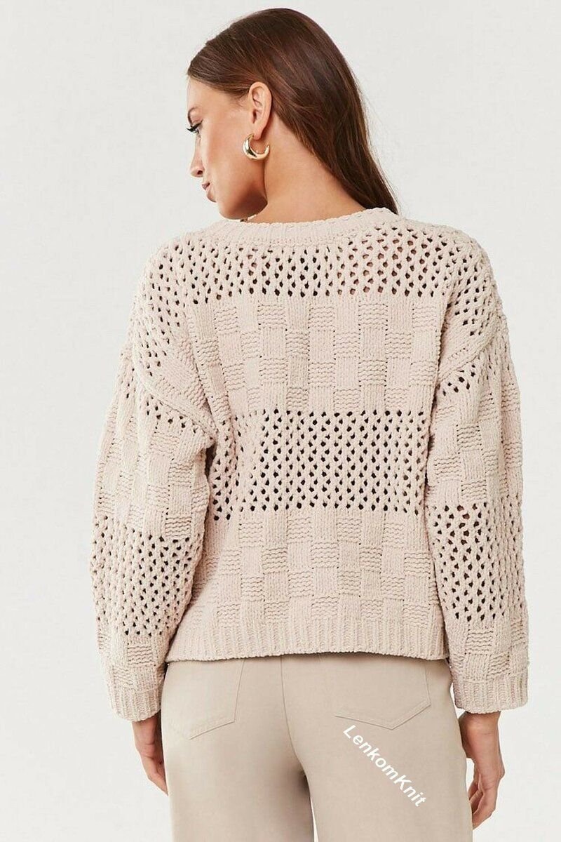 В этом джемпере эффектно чередуется теневой узор в виде квадратиков из лицевых и изнаночных петель и ажурный узор - сетка.
