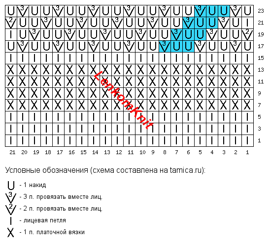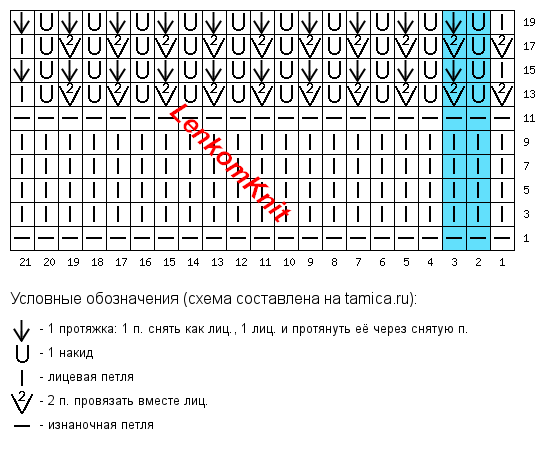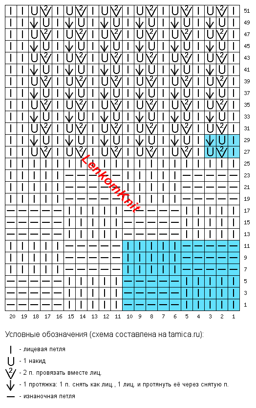На схеме выделен раппорт узора. В ширину он - всего две петли, а в высоту - 20 рядов.