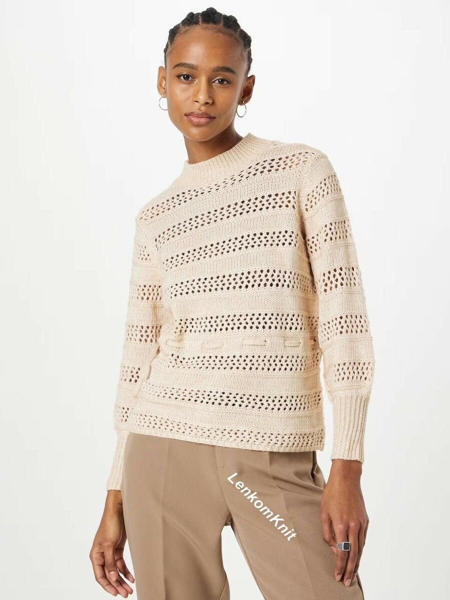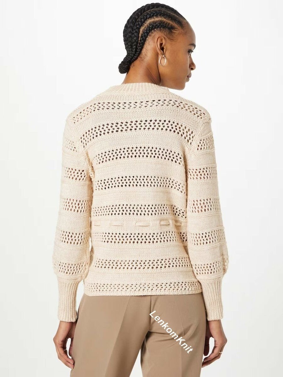 В этом джемпере использован ненавязчивый, но симпатичный узор: полосы лицевой глади чередуются с полосами сетки. Их разделяют два ряда изнаночной глади.