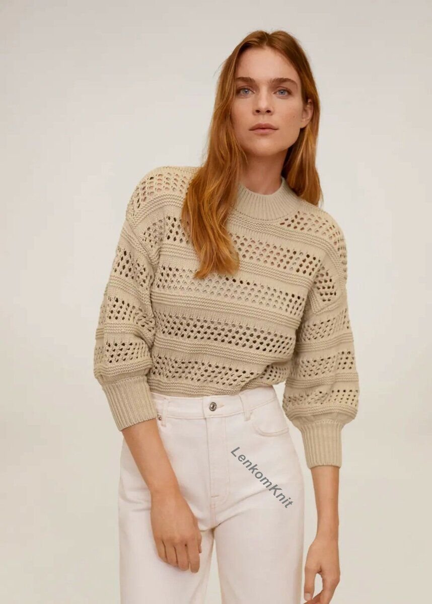 Особый интерес этот джемпер вызывает только за счет сочетания узоров: лицевая гладь, платочная вязка и крупная сетка.