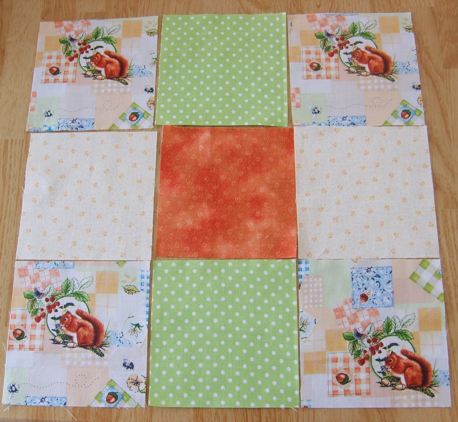 Берем 9 одинаковых по размеру квадратов. Размер может быть любой. В данном случае у меня 5х5инчей. Цветовая подборка тоже на свое усмотрение. Это могут быть 9 разных тканей, или 2,3, 4. Все зависит от ожидаемого конечного результата. Я взяла 4. Скомпоновала их вот так: