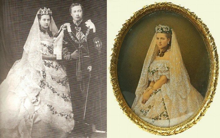 Если свадебный наряд самой Виктории было хотя и по-королевски прекрасным, но, скорее, изящным, чем роскошным – белый атлас, полоска драгоценного кружева, бриллиантовый убор и брошь, подарок жениха – то, когда спустя двадцать три года замуж выходила Александра Датская, ставшая супругой старшего сына королевы, будущего Эдуарда VII, наряд поражал воображение своей роскошью.Александра не обошлась одним лишь кружевным воланом!Будущая законодательница английских мод, была одета в белое атласное платье, пышные юбки которого, согласно тогдашней моде, поддерживал кринолин. Оно было украшено "гирляндами из флёрдоранжа и мирта и оборками из тюля и хонитонских кружев". Так же был отделан шлейф из "серебряного муара".