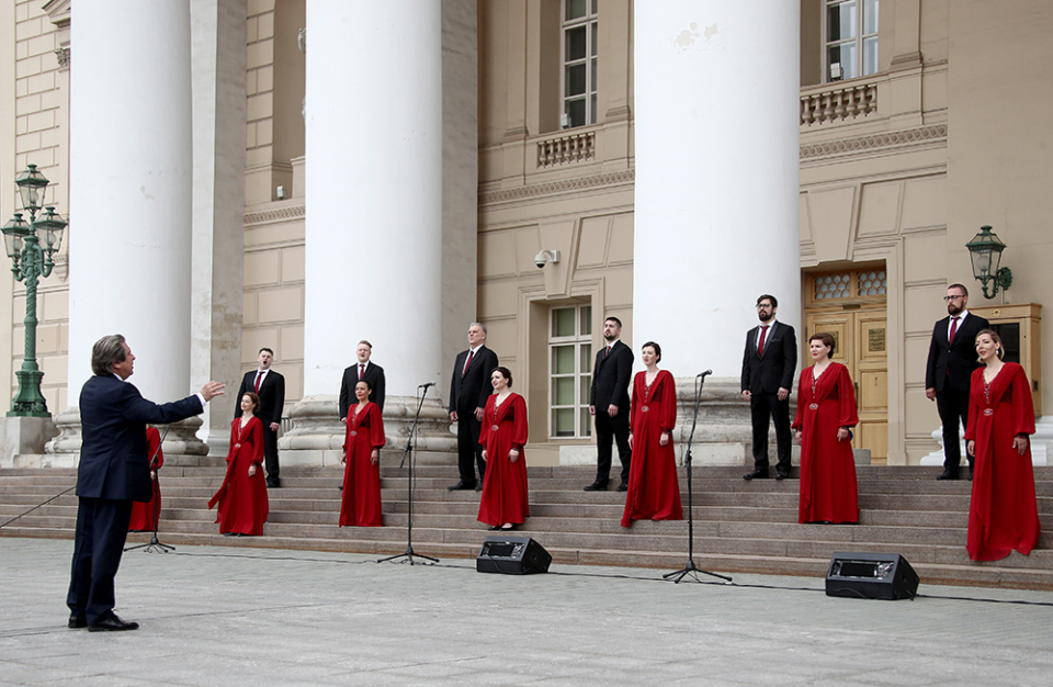 Дирижер Геннадий Дмитряк (слева) во время концерта на ступенях Большого театра в День России.