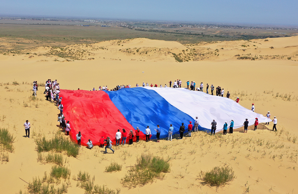 Российский флаг развернули на песчаном бархане Сары-кум в честь Дня России.