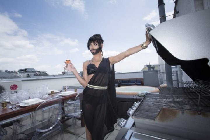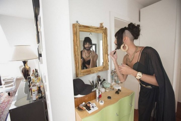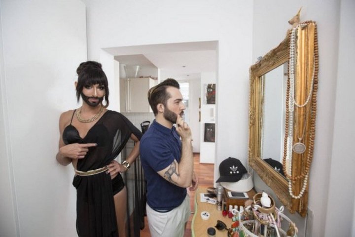 Бородатая победительница Евровидения-2014 Кончита Вурст пригласила фотожурналистов к себе домой, где живёт в законном браке с танцовщиком бурлеск-шоу Жаком Патриаком.