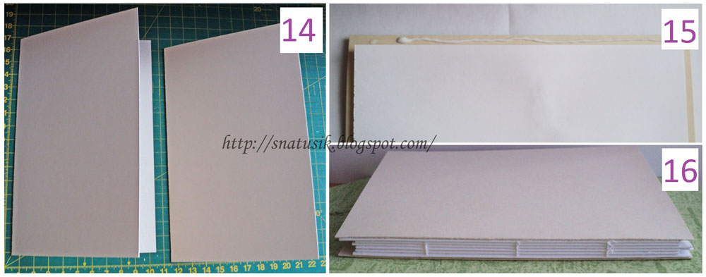 Пока сохнет блок, готовим форзацы – 2 шт. Вырезаем плотную бумагу нужного формата и делаем биговку (фото14). Мажем клей на расстоянии 1 см от сгиба (остальную часть прикрываем черновиком) – фото 15. Приклеиваем форзацы к блоку (фото 16) и кладем под пресс.