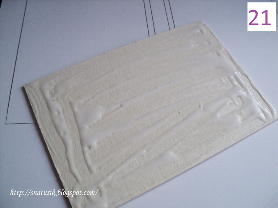Раскладываем на бумаге для обложки наши картонные заготовки следующим образом: от края отступая 1.5 см, между обложками и корешком 0,5 см (фото 20) и обводим карандашом (чтобы при наклеивании не было погрешностей). Мажем картон клеем и приклеиваем (фото 21).