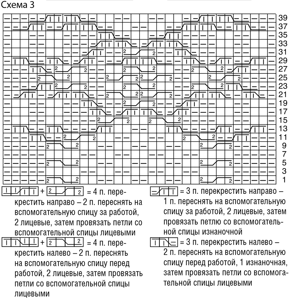 Спицы №4, вязать по схеме 3. В высоту повторять с 1-го по 40-й ряд.