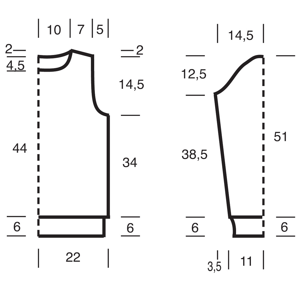 Вязать, как спинку, но с более глубокой горловиной. Для этого уже через 44 см = 154 р. от нижней планки закрыть средние 30 п. и для закругления горловины закрыть с внутреннего края в каждом 2-м р. 1 раз 4 п., 1 раз 3 п., 3 раза по 2 п. и 4 раза по 1 петле.