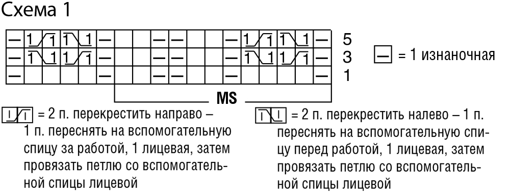 Вязание рядами в прямом и обратном направлениях спицами №3,5: количество петель кратно 12 + 6 п. + 2 кром. Вязать по схеме 1. В ширину начинать с кром., повторять раппорт, заканчивать петлями после раппорта и кром. В высоту повторять с 1-го по 6-й ряд.