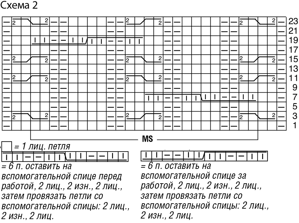 Спицы №4, количество петель кратно 24 + 6 п. Вязать по схеме 2. В ширину начинать с петель перед раппортом, раппорт выполнить 2 раза, закончить петлями после раппорта = 54 п. В высоту повторять с 1-го по 24-й ряд.