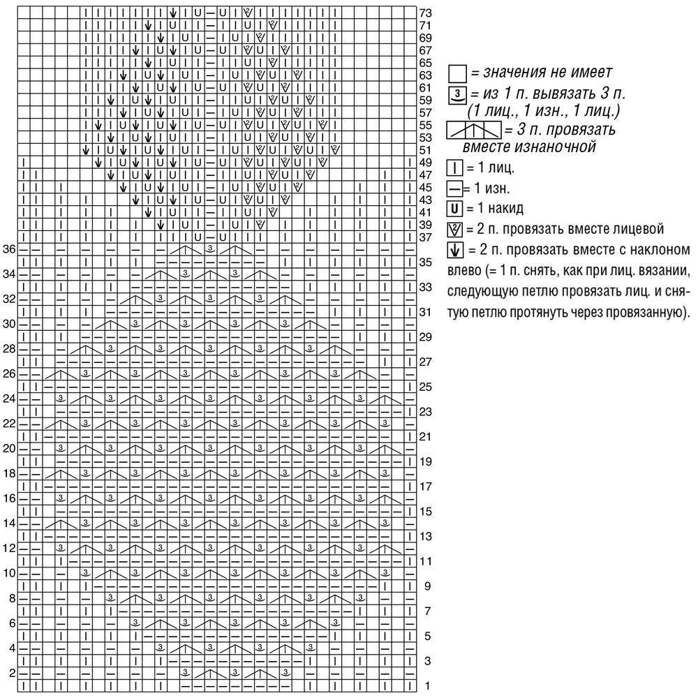 Вязать по приведенной схеме. На ней даны все лицевые ряды и часть изнаночных. В неприведенных изн. рядах петли и накиды провязывать изнаночными. В высоту выполнить 1 раз с 1-го по 74-й ряд.