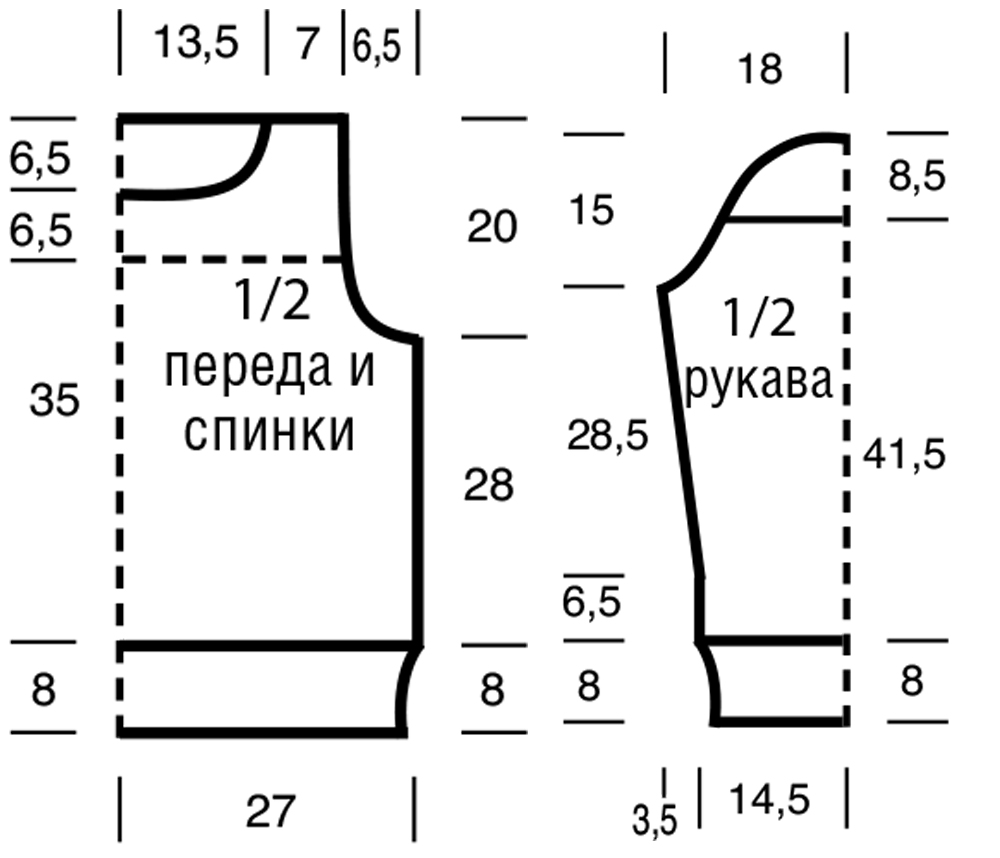 Через 13 cм = 24 р. от места перехода на более толстые спицы все петли закрыть в одном ряду (средние 24 п. образуют край горловины, по 6 п. с обеих сторон от них — плечи).