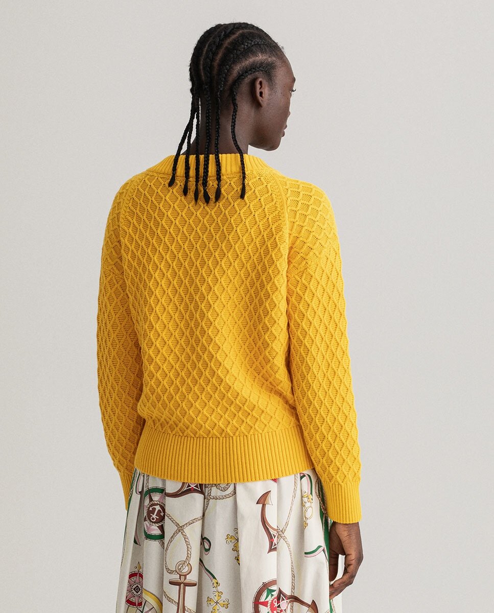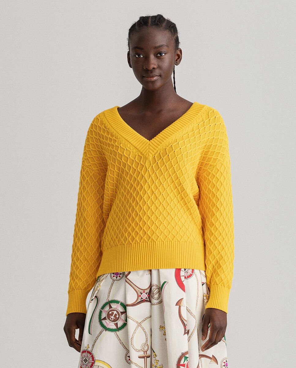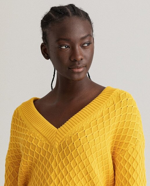 Свитер этот мне очень понравился: яркий чистый цвет, интересный (но неброский) узор и классический покрой. Свитер связан из 100% хлопка, спущенный рукав и красивый V образный вырез. Это лето очень жаркое, и почти все хорошо загорели (даже кто и не старался). Свитер в таком цвете будет очень красиво подчеркивать загорелую кожу.