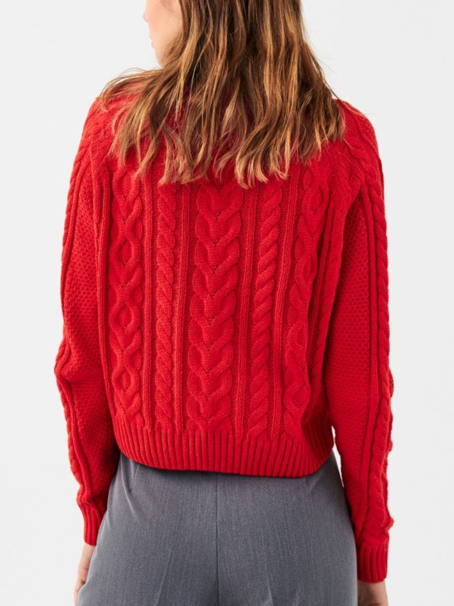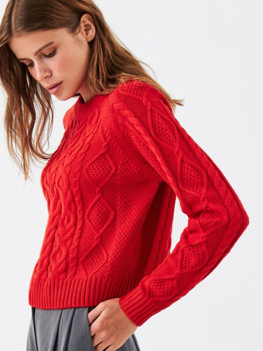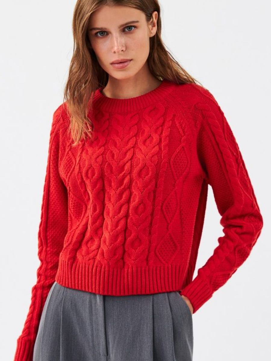 Свитер укороченный, узорчатый, яркого красного цвета. Состав этого свитера не самый плохой - хлопок 60%, акрил 40%.