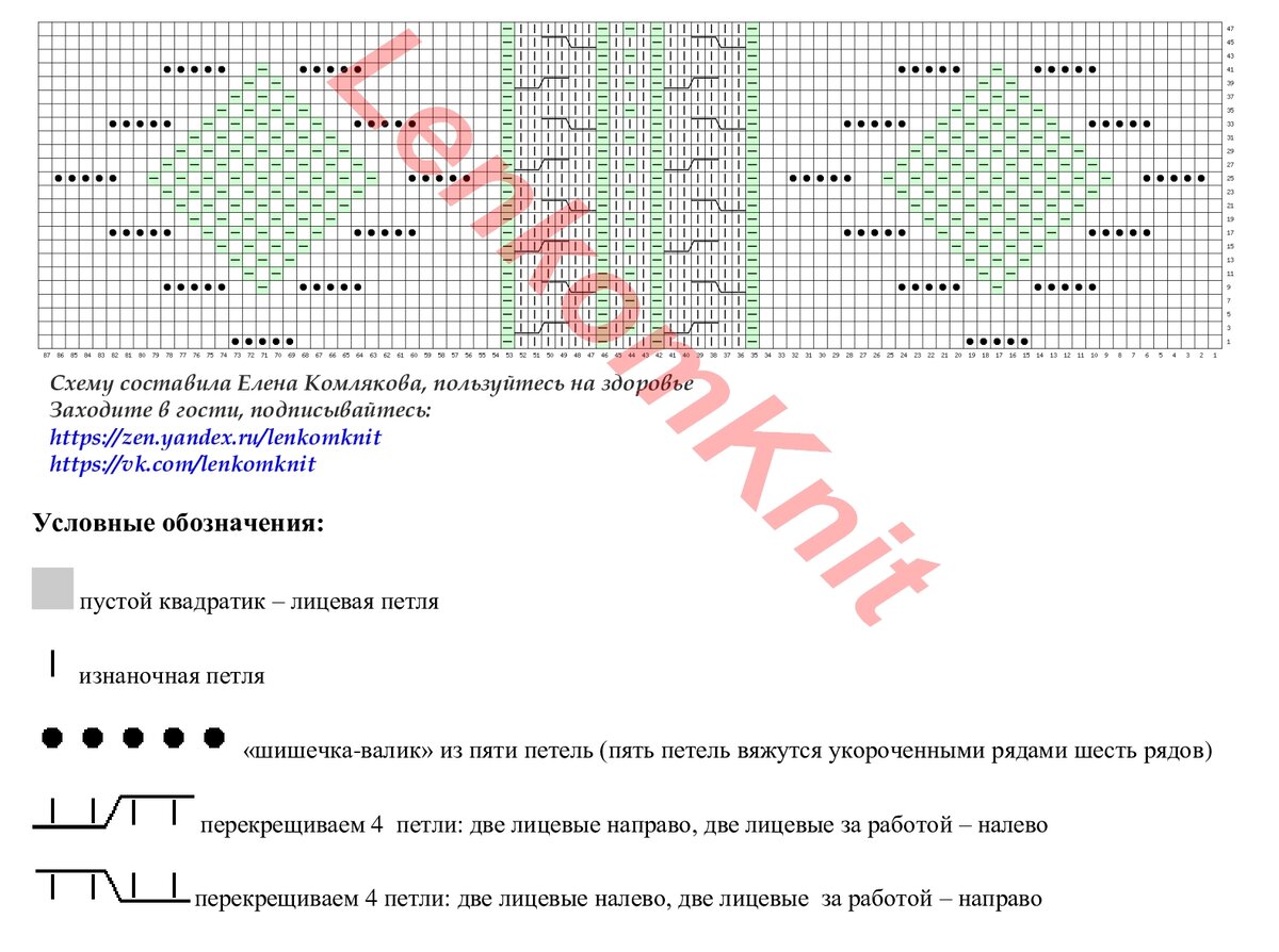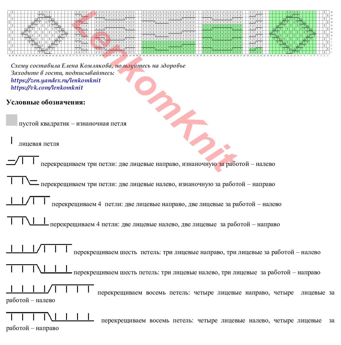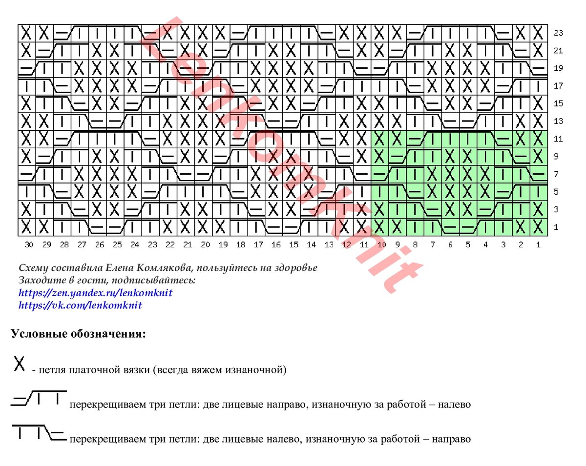 На схеме зеленым цветом выделен раппорт узора - 10 петель в ширину и 12 рядов в высоту. Чтобы узор выглядел так же, как на фото, нужно подбирать тонкую пряжу (450-500 м / 100 гр).